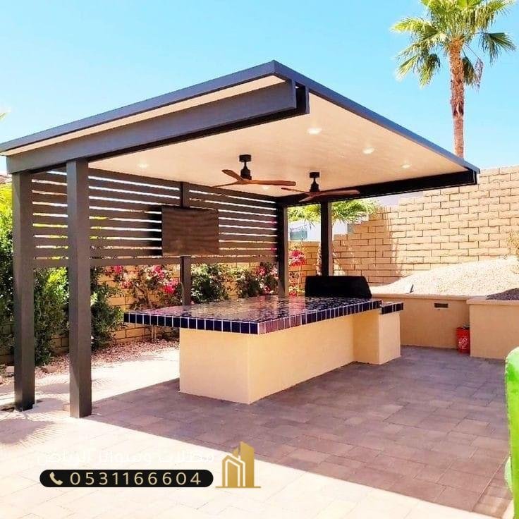 تغطية البرجولات بمواد عازلة أو ديكورية (بولي كربون، شينكو، خشب صناعي).
